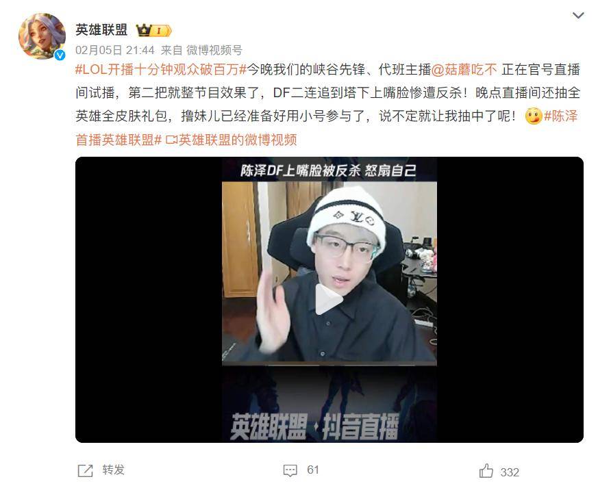 昨日晚间,知名游戏主播陈泽现身《英雄联盟》抖音官方直播间进行技术测试,首秀仅10分钟,观看人数就已突破百万。