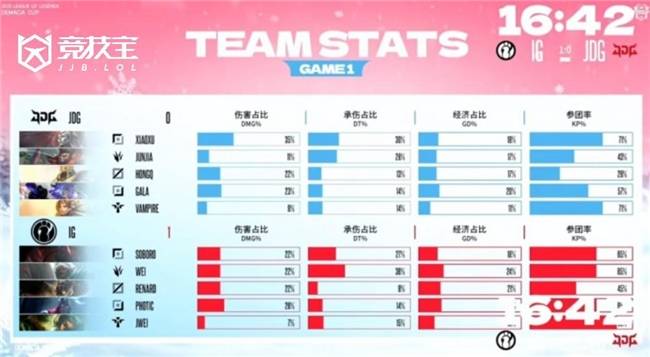 比赛开局,xiaoxu亚恒在上路完成单杀,帮助JDG拿下一血。但Wei安蓓萨迅速通过gank完成反击稳住局势。下路对拼中,Jwei泰坦配合Photic维鲁斯多次打出完美联动,直接让GALA芸阿娜遭遇连续阵亡。进入中期后,iG在小龙团中的拉扯与站位明显更胜一筹,Soboro塞恩顶在前排让JDG难以处理。HongQ沙皇和GALA芸阿娜多次被Wei安蓓萨大招强行击杀,iG接连在小龙与厄塔汗团战中团灭对手,甚至不需要争夺大龙和龙魂,仅凭炸弹人推进便在27分钟结束比赛,率先拿到胜利。