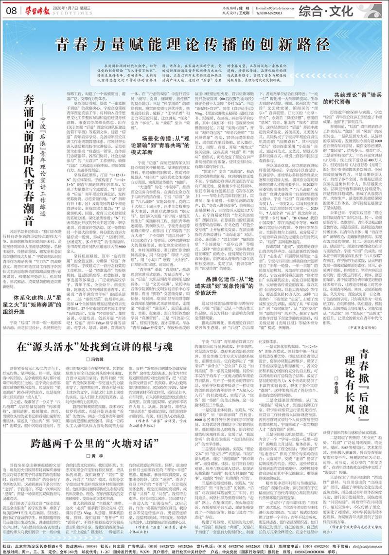 近日,《学习时报》整版刊发宁波“后浪”青年理论宣讲工作实践报道,让这股源自东海之滨的理论传播热潮走向全国,为新时代党的创新理论大众化传播提供了鲜活样本。
