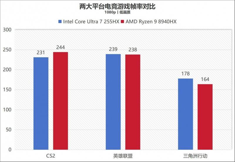 电竞游戏:酷睿版在《三角洲行动》中表现突出,帧率178帧 vs 164帧,领先9%,且1%Low帧(反映画面稳定性)领先幅度达27%;《英雄联盟》两款机型基本持平(239帧 vs 238帧);《CS2》中锐龙版以244帧 vs 231帧领先5%。