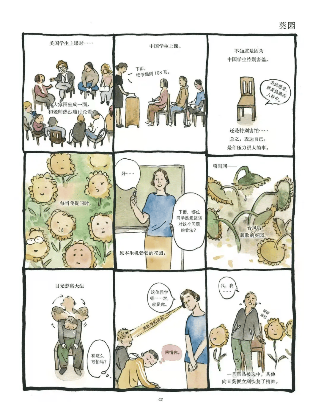 那是站在讲台上,当她向下看,学生们不敢看她眼睛那一刻的感受。在漫画里,阮筠庭形容一颗颗入学时昂起的“狮子头”们,到后来变成了“向日葵”。作为老师的“美杜莎”,一旦选中一位同学作答,其他“向日葵”才松了口气,恢复点精气神。