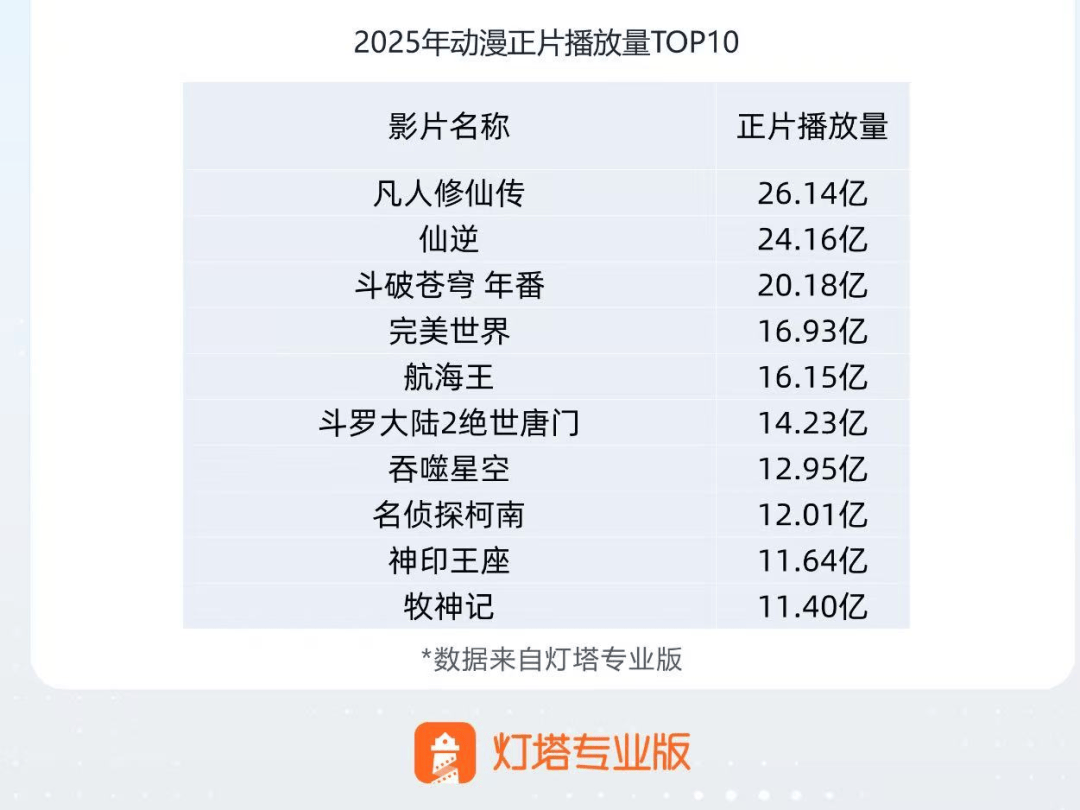 这些头部作品构成了金字塔尖的流量高峰。其中,2025动漫总榜全年播放量TOP10正片播放量均超10亿次,TOP3均超20亿次。TOP5分别为26.14亿次播放的《凡人修仙传》,24.16亿次播放的《仙逆》,20.18亿次播放的《斗破苍穹年番》,16.93亿次播放的《完美世界》,以及16.15次播放的《航海王》。