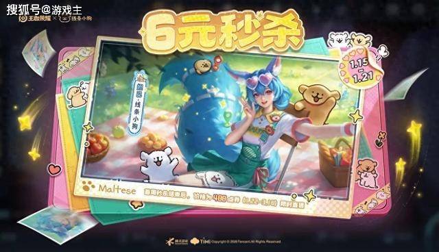 1月15日至3月18日,会上架妲己跟线条小狗的联动新皮肤,品质是勇者限定,价格是488点券,首周也会打1.2折降价至60点券。