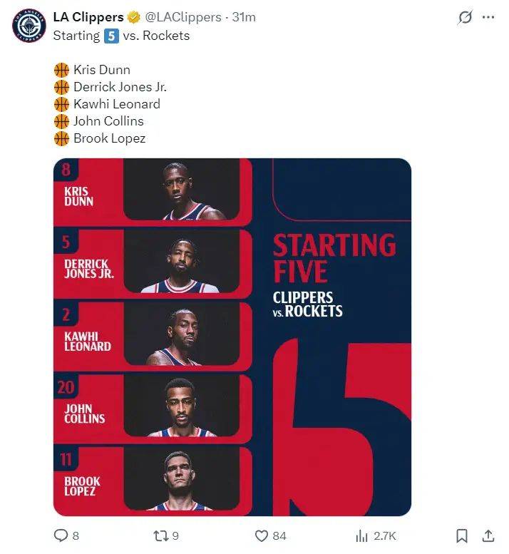 这是两队背靠背的第二场较量,上一场火箭取胜,本场快船誓要扳回一城。比赛开局,火箭迅速进入状态,进攻端多点开花,防守端压制快船,最多领先达到15分,半场结束时仍手握10分优势,胜利天平看似倾向火箭。三节战罢,快船将分差缩小至6分,为末节反击埋下伏笔。 前三节小卡刻意节省体能,数据并不亮眼,但进入末节决战,他彻底开启“杀神模式”。里突外投连续得分,单节狂轰19分,带领快船打出一波流攻势直接反超比分。关键时刻,小卡攻防一体,4次抢断打断火箭进攻节奏,篮板保护稳如泰山,用全能表现撑起球队。
