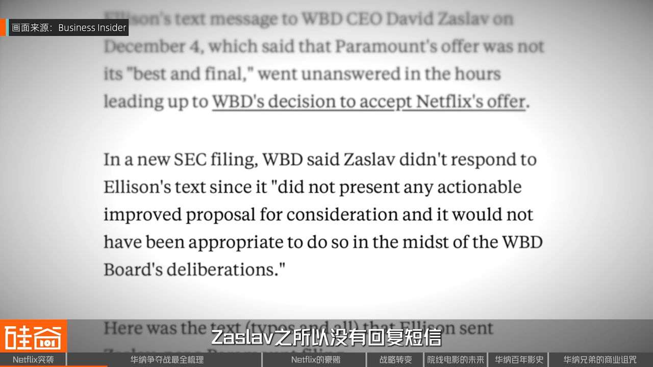 在华纳提交给美国证交会的一份文件中可以看到,Zaslav之所以没有回复短信,是因为他认为这条短信“没有提出任何可操作的方案,而且已经过了收购提案截止日期,在华纳董事会审议期间这样做也不合适”。
