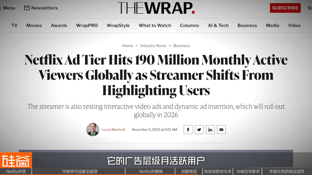 2022年底,Netflix打破了自己坚持多年不打广告的承诺,正式推出了广告支持计划;到2025年底,它的广告层级月活跃用户已经突破了1.9亿,而利用IP地址和设备识别技术打击账号共享的新规则,直接拉动了2023到2025年营收激增。