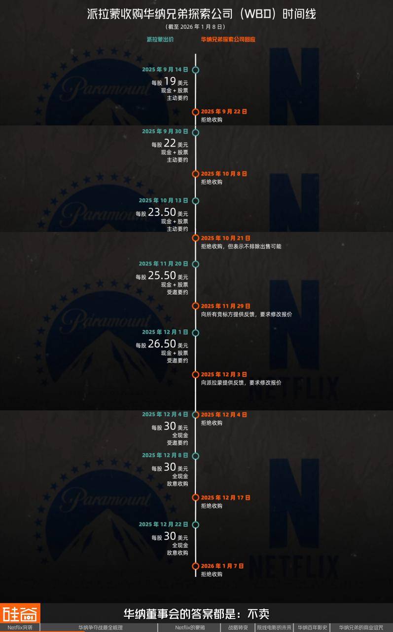 2025年12月5日,Netflix扔下827亿美元收购华纳兄弟探索的重磅炸弹,仅仅一个周末后,派拉蒙便发起反击,开出每股30美元(比Netflix高出8%)的价格发起敌意收购,随后政府监管、资金来源、董事会斗争、代理权诉讼等等接踵而至。
