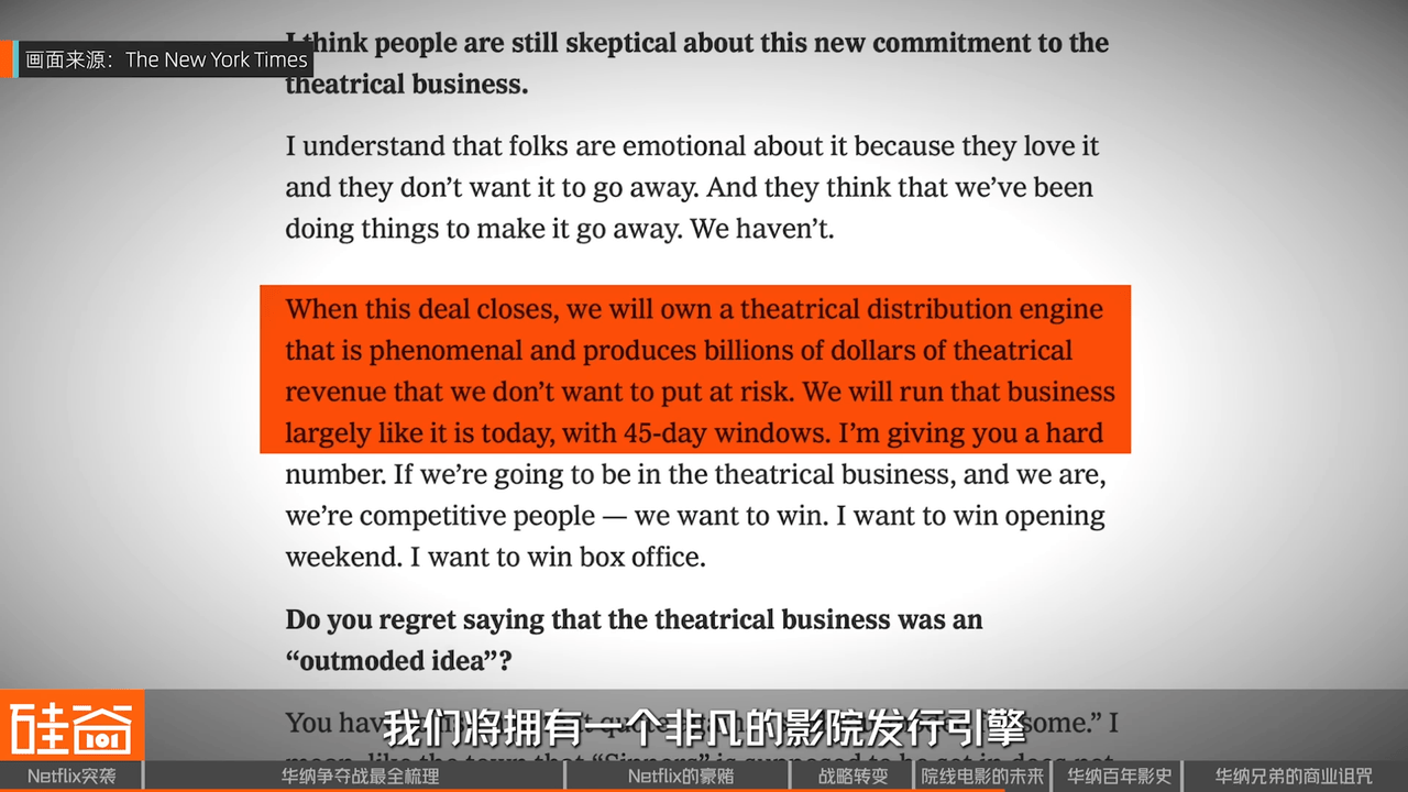 在1月16日与《》的专访中,Netflix的Co-CEO Ted Sarandos说:“这笔交易完成后,我们将拥有一个非凡的影院发行引擎,它将产生数十亿美元的影院收入,我们不想让这些收入面临风险,我们将基本上像现在这样运营这项业务,有45天的窗口期。”而此前他也对媒体表示,Netflix能保证华纳每年在院线