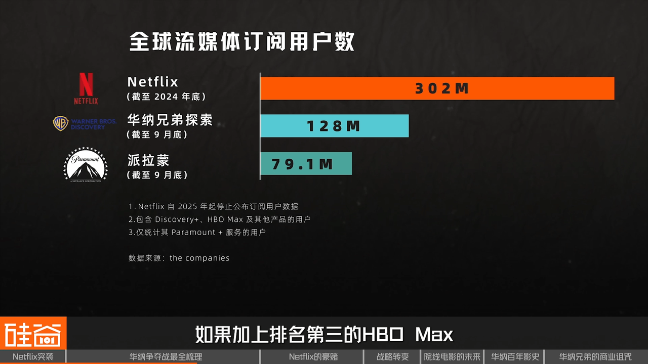 首先,最主要的担心在于流媒体市场的集中度。截至2024年底,Netflix在全球拥有约3亿订阅用户,是流媒体行业的绝对领导者,如果加上排名第三的HBO Max的约1亿订阅用户,合并实体将控制近4亿用户的观看数据和消费习惯。这样庞大的规模,是否代表着Netflix占据支配地位?