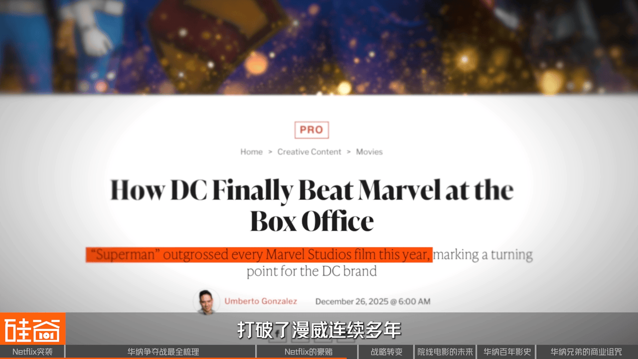 同样华纳也有不少IP让Netflix翘首以待据为己有。以DC宇宙为例,作为好莱坞最被低估的IP之一,DC与迪士尼旗下的漫威相比在商业上已有巨大的差距,漫威已通过30多部电影交织的故事情节,在全球斩获超过300亿美元的票房;而DC宇宙则惨淡的可怜,从2013年的《钢铁之躯》到2023年的《蓝甲虫》,14部电影平均全球票房仅为4.79亿美元;不过,今年上映的《超人》打破了漫威连续多年主导年度超级英雄票房的纪录,DC制片厂的两个主管正在竭尽全力让DC宇宙起死回生。