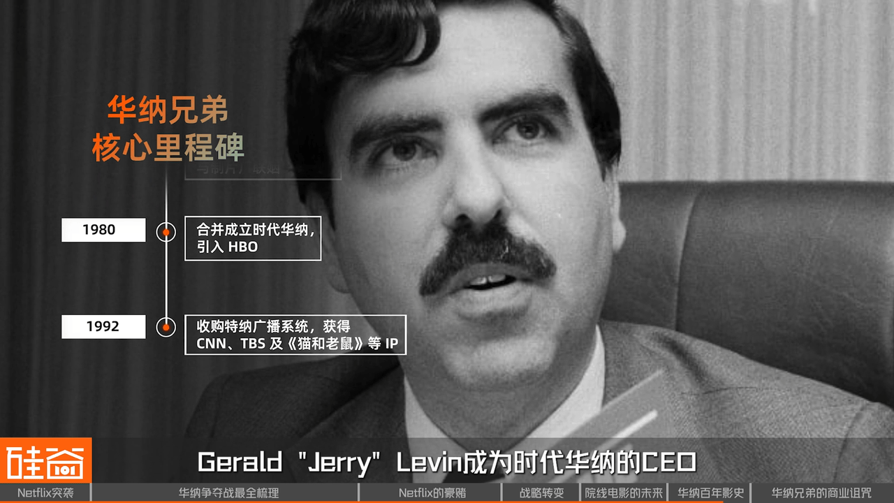 1992年,收购了华纳的Steve Ross去世,Gerald Jerry Levin成为时代华纳的CEO。在Levin手上,时代华纳收购了特纳广播电视系统,这笔交易为他们带来了CNN、TNT、TBS等有线电视网,也带来了《猫和老鼠》、《飞天小女警》经典的动画IP。