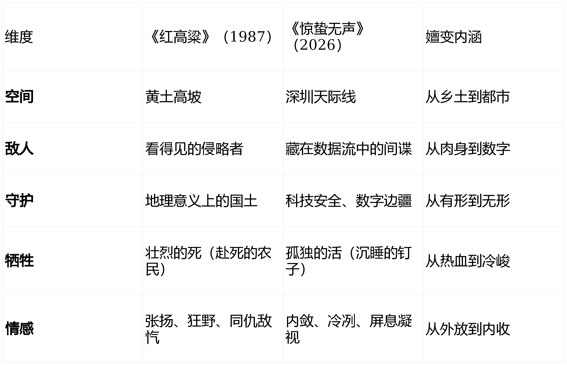 影评的核心分析框架,是1987年《红高粱》与2026年《惊蛰无声》的对照。这一对照贯穿全文,形成了四组张力: