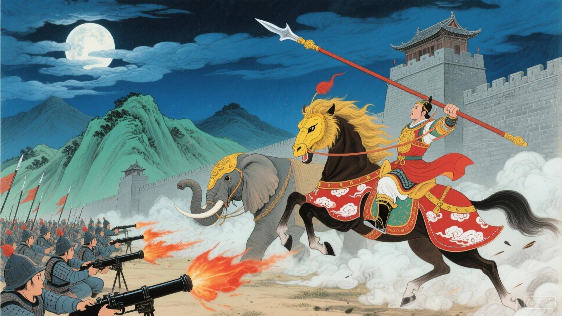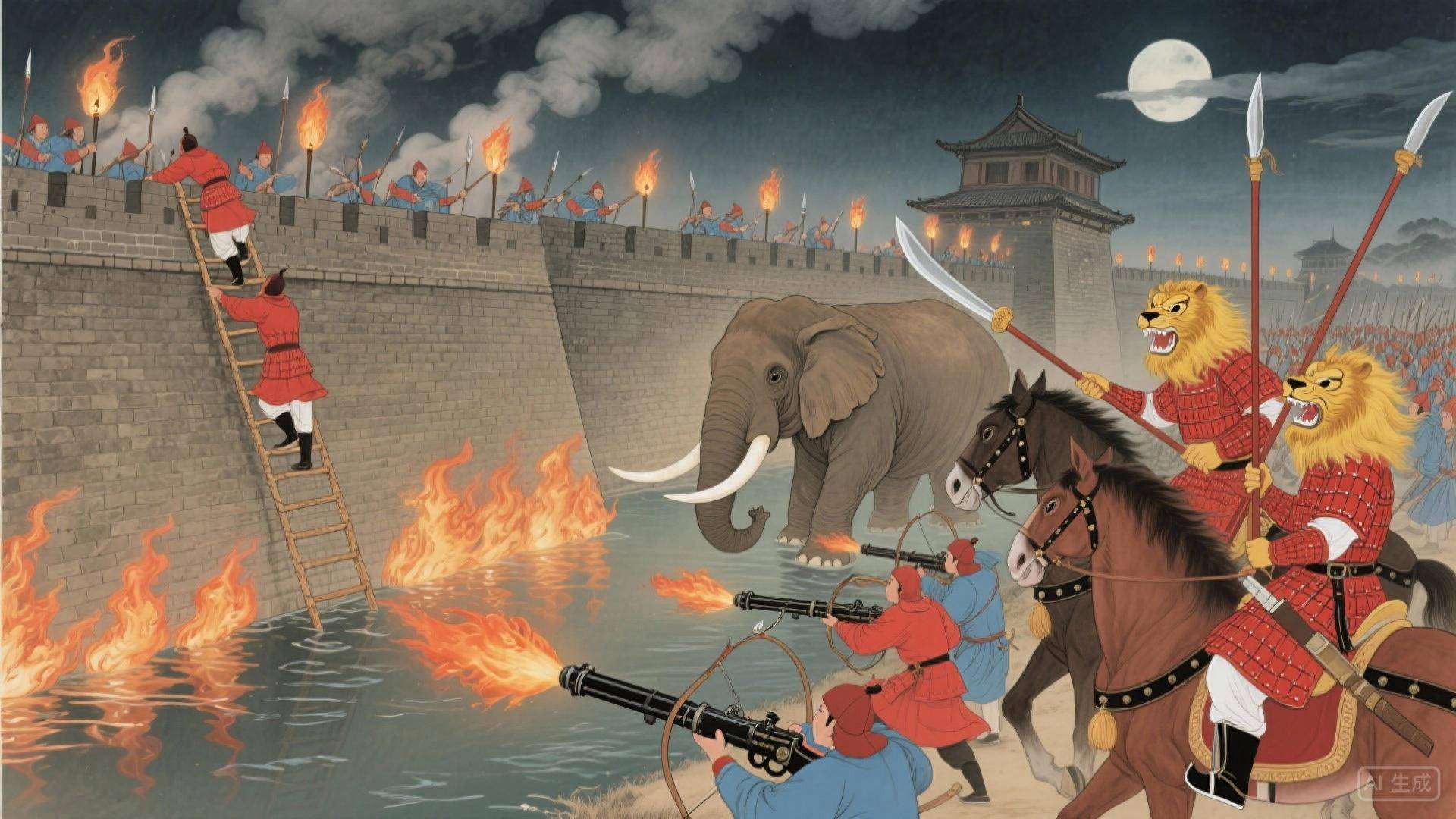 张辅首先遭遇的是安南军依托多邦城构建的防御体系。该城地势险要,胡氏在此部署了战象部队作为核心战力。明军创造性地采用画狮蒙马战术——将狮子画像蒙在马首,利用象群对狮子的畏惧心理破阵,同时辅以火器轰击。这场战役中,明军夜袭登城,斩杀安南军主将,一举攻克西都,彻底瓦解了胡朝的北部防线。