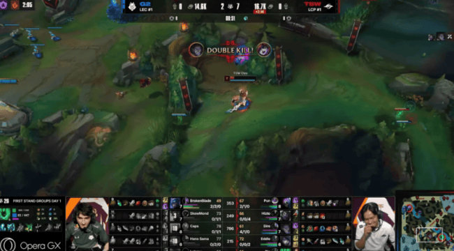 本场比赛,G2战队在蓝色方,TSW战队在红色方。阵容方面,G2战队选择:BrokenBlade慎、SkewMond巨魔、Caps沙皇、Hans Sama芸阿娜、Labrov璐璐,TSW战队则是:Pun贾克斯、Hizto蒙多、Dire塞拉斯、Eddie厄斐琉斯、Bie锤石,本局比赛第8分钟,TSW野区打出0换4,前期TSW一度取得优势。比赛第13分钟,G2打出0换2后迅速缩小劣势!
