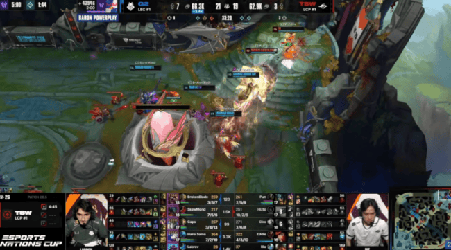 本场比赛,TSW战队在蓝色方,G2战队在红色方。阵容方面,TSW战队选择:Pun奥恩、Hizto皇子、Dire阿萝拉、Eddie飞机、Bie洛,G2战队则是:BrokenBlade兰博、SkewMond蔚、Caps阿狸、Hans Sama伊泽瑞尔、Labrov巴德,本局比赛前期 G2一度占据主动,比赛第17分钟Dire阿萝拉爆砍三杀,TSW打出1换3缩小劣势!