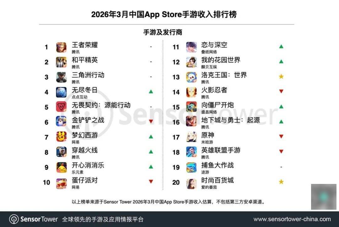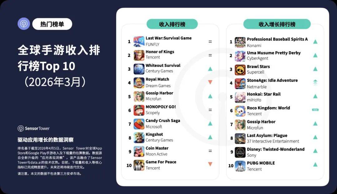 带动下,整个3月收入大涨62%。近半年,《我的花园世界》始终在发力,早在2025年游戏就曾活用鲜花承载着“被赠予、被关怀”的情感隐喻,借助“游戏内种花可领实体花”的操作创造从虚拟到现实的惊喜感,命中女性群体对“被重视感”的渴望。后续产品通过热门影视联动和人气明星合作等多元运营策略,持续放大竞争力,上线个月流水已突破8000万美元,成为国内女性向游戏赛道的又一颗亮眼新星。除却上榜的30家厂商,余下冲入全球收入