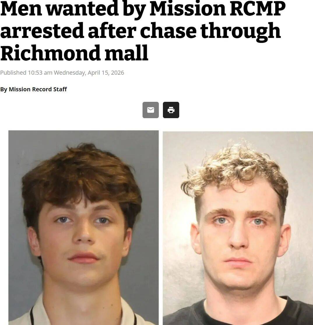 就在本周一,列治文Richmond Centre商场里炸了锅。两名背负多项重罪的通缉犯——28岁的William Beale和19岁的Dayton Zahn,在那儿悠哉游哉地逛街呢。