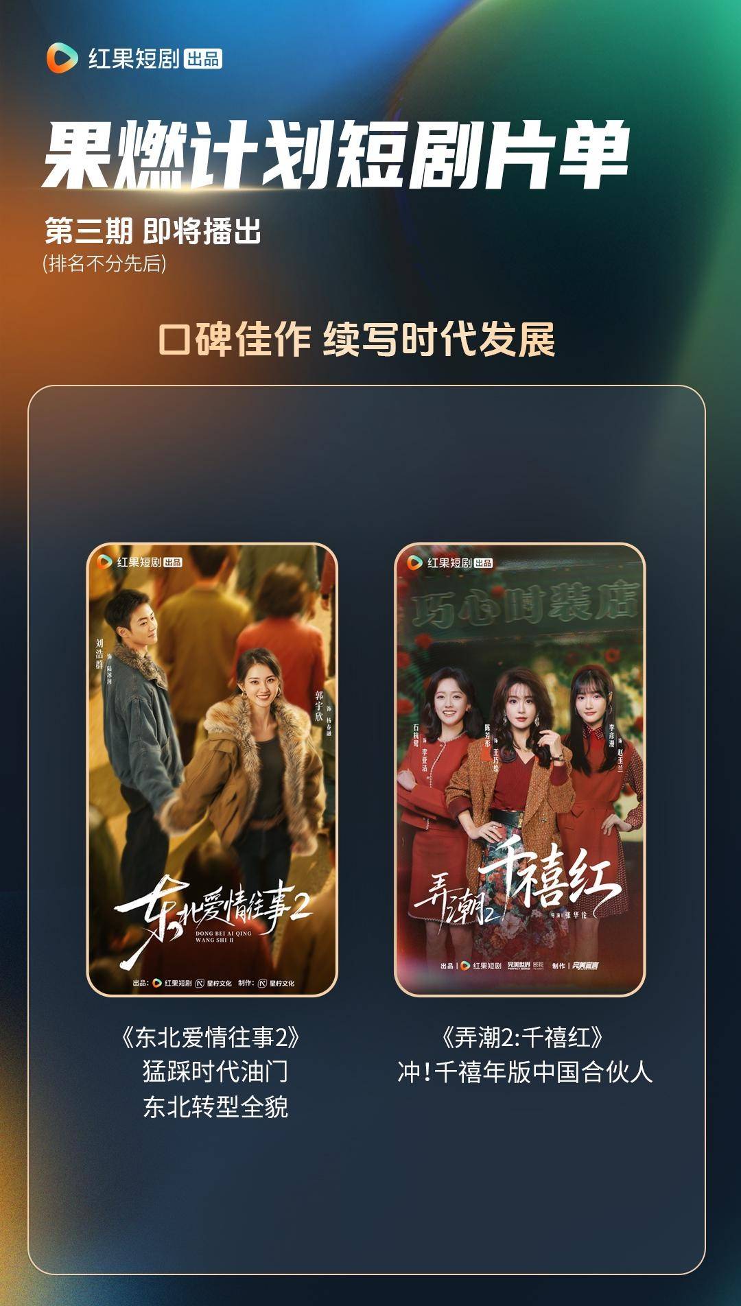 得益于“果燃计划”第一、二期片单项目的成功孵化,一批经过市场验证的短剧IP在此次片单中迎来了续作。其中,以90年代东北为背景、凭借真挚情感与时代记忆获得优异市场表现的《东北爱情往事:闪婚玫瑰》,其续作《东北爱情往事2》已由原班人马打造完成。同样,“果燃计划”首期片单中的爆款作品,展现女性创业与时代浪潮的《弄潮》,其续作《弄潮2:千禧红》也已开机,继续讲述“三姐妹”的奋斗故事。