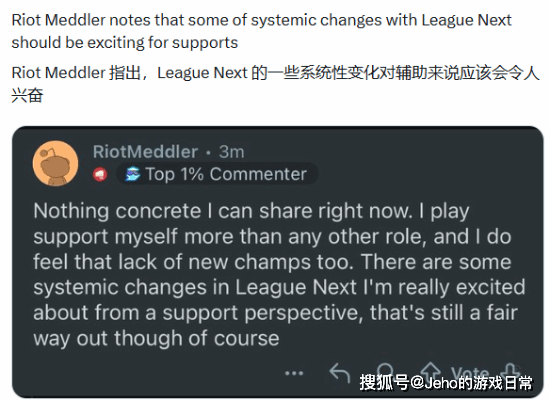 不过Meddler也给大家吃了定心丸,辅助位的重大调整,会在2027年的“League Next”更新中正式落地。他特意强调,这次更新里有很多从辅助视角出发的系统性改动,虽然还需要一段时间等待,但绝对值得大家期待。毕竟连设计师自己都玩辅助,总不会再像以前那样忽视这个位置的痛点。